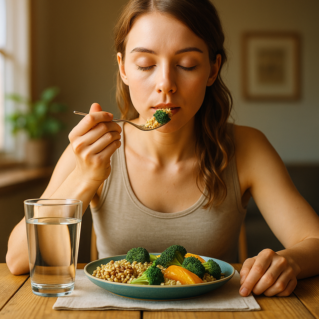 식사 속도를 늦추면 불필요한 섭취를 줄이고, 과식이나 폭식 충동을 완화하는 데 도움이 됩니다.